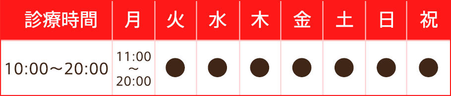 休診日がなく、毎日夜20時まで受付しており土曜、日曜、祝日も受付しておりますのでお仕事や学校で忙しくて中々時間がとれない方でも仕事帰りや土曜、日曜、祝日にご来院頂けます。